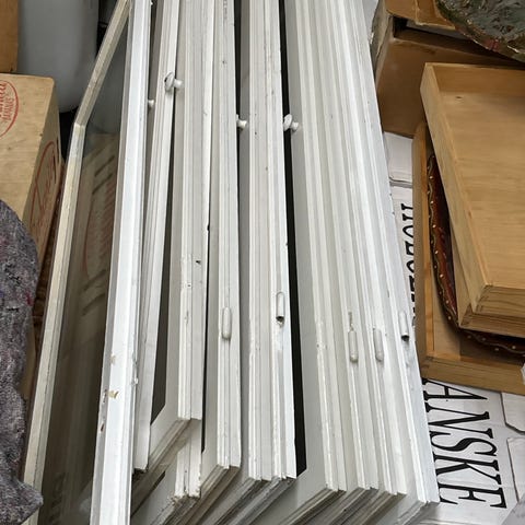 Glaslåge til skab i hvid ramme. Lågen har glasfelt i midten og er udstyret med metalhængsler. Øverst ses en metal-/aluliste. Egnet som låge til køkken- eller vægskab, vitrineskab eller lignende opbevaringsmøbel, hvor der ønskes indsyn gennem glas.