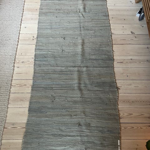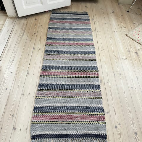 Vævet kludetæppe med stribet mønster. Måtten har et flerfarvet design med indslag af lilla, orange, grøn, blå og beige. Mål: 113 x 56 cm.
