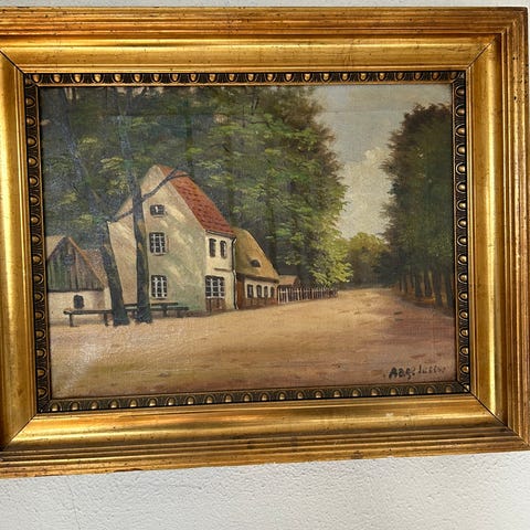 Maler med motiv af Peter Liep s hus.Maleriet er indrammet i en kraftig, profileret træramme med sort og gylden staffering. Signatur ses nederst i højre hjørne. Bagsiden viser lærred spændt op på træramme 65 cm x 45 cm. Ramme 89 cm x 70 cm.