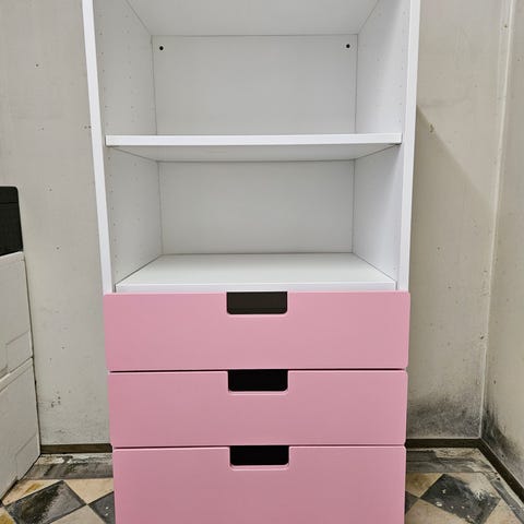 IKEA børnemøbel opbevaringsmodul i hvid med blå fronter. Møblet består af en reol-del med åbne hylder samt en del med skuffer og en lavere topplade, der kan bruges som sidde- eller legeflade. Skufferne har udskårne greb for nem åbning. Egnet til opbevaring af legetøj, bøger og andre ting på børneværelset.