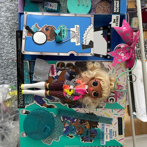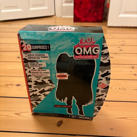 L.O.L. Surprise OMG Dance Dance Dance Virtuelle dukke. Dukken lyser i bluelight og medfølger en lampe. Dukken har langt pink hår og futuristisk danseinspireret outfit med neonfarver. Medfølgende tilbehør omfatter blandt andet sko, hårbørste, dåseformet bluelight lampe, dukkeholder og indbygget baggrund i æsken, der kan bruges som lille lege-scene. Dukken er ledet i arme og ben, så den kan poseres til leg og udstilling. Den er dog skadet i det det ene håndled.