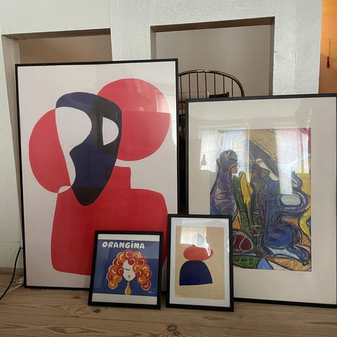 Flotte abstrakte billeder sælges helst som sæt, men kan også sælges separat ved interesse. Mærket er ukendt. Bagsiden er ens på alle tre billeder. Billederne kan afhentes i København K. De har alle samme størrelse af 45,5 x 45,5 cm.