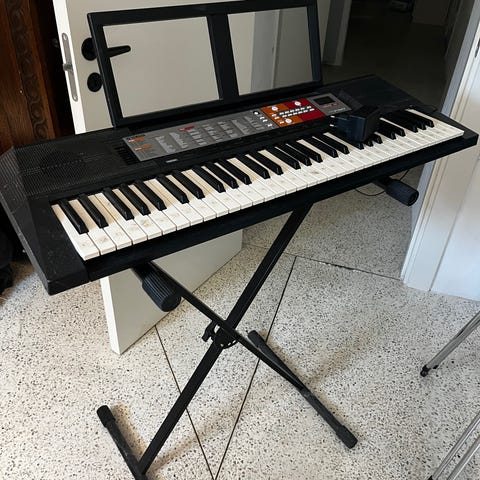 Yamaha EZ-220 keyboard. Modellen har indbygget display, forskellige lyde, rytmer og indlæringsfunktioner. Tangenterne er mærket med noder, hvilket kan understøtte begyndere i at lære at spille. Keyboardet står på et X-stativ, som kan justeres i højden. Velegnet til øvning derhjemme, musikundervisning eller hobbybrug.