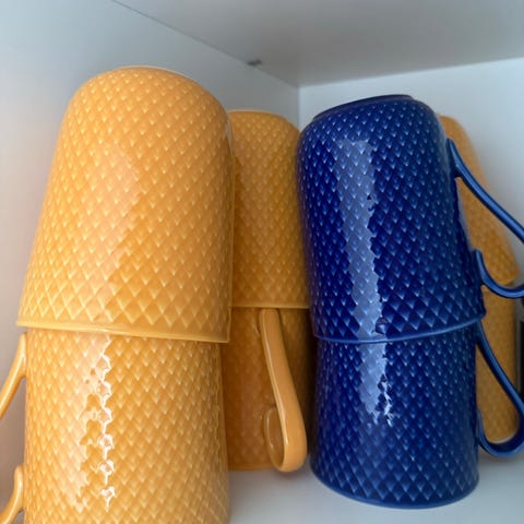 Iittala krus i keramik med rillet/diamantmønstret overflade. Sættet består af to krus i farverne pink og grøn. Krusene kan anvendes til varme og kolde drikke i køkken og hverdag.