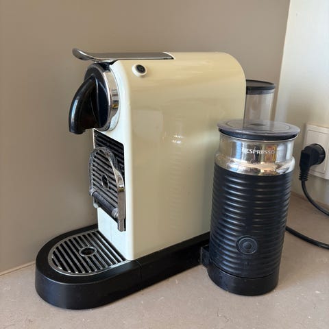 Hvid Nespresso Citiz med mælkeskummer. Netop afkalket og rengjort.