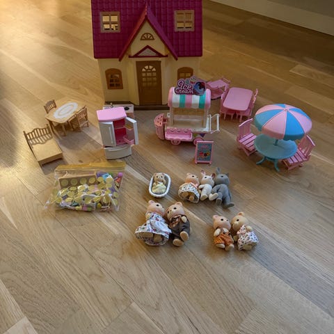 Sylvanian Families legehus med løs trappe. Huset har rødt tag, veranda med gelænder og åbning i siden til leg med figurer. Trappen kan placeres ved huset efter ønske. Egnet som tilbehør til Sylvanian Families figurer og andre små dukker i tilsvarende størrelse.