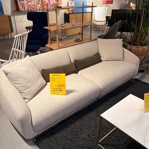 Sofaen fra Wendelbo er 341 cm lang med en 145 cm bred chaiselong i højre side. Den har en siddehøjde på 44 cm og er 100 cm dyb, modul 01 og modul 21 + modul 8
