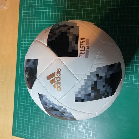 Adidas Telstar 18 fodbold i hvid med mørke felter. Modellen er officiel VM 2018 Russia-udgave, som ses af logoet på bolden. Bolden leveres i plastemballage. Velegnet som fodbold til spil eller som samlerobjekt for fodbold- og VM-merchandise.