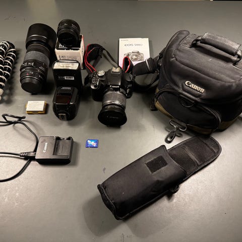 Canon digitalt spejlreflekskamera med udskiftelige objektiver. På billederne ses kamerahus med standard zoomobjektiv monteret samt et ekstra Canon EF 50mm f/1.4 objektiv. Kameraet har indbygget skærm på bagsiden og bærestrop. Velegnet til generel fotooptagelse, portrætter og andre situationer, hvor der ønskes kontrol over indstillinger som blænde, lukkertid og ISO. Sælges som digitalt spejlreflekssæt med de viste objektiver.