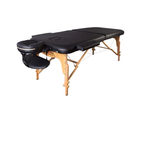 Massagebriks i sammenklappeligt design med sort polstring i kunstlæder og stel i træ. Bordet har polstret liggeflade samt tilbehør som hovedstøtte og puder. Egnet til massage, behandling og velvære i hjemmet eller klinik. Stabil konstruktion med justerbare ben for tilpasning af arbejdshøjde.