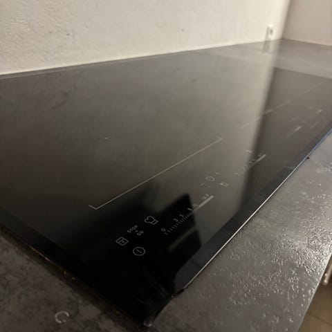 AEG induktionskogeplade i sort glas. Kogepladen er i fin stand og praktisk med sin powerboost funktion. Den har en del synlige ridser, men virker upåklageligt.