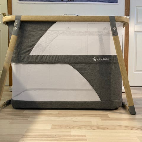 Kinderkraft rejseseng til børn i sort tekstil. Sengen er sammenklappelig og består af en rektangulær ramme med polstrede sider og en madrasbund. Materialet er primært stof og metal/plast i stellet. Velegnet som ekstra seng til baby eller småbørn på rejser eller som midlertidig soveplads i hjemmet. Leveres med sammenklappeligt stel og tilhørende madrasdele og bund, som kan pakkes kompakt for opbevaring og transport. Sengen måler H76 x B65 x L125