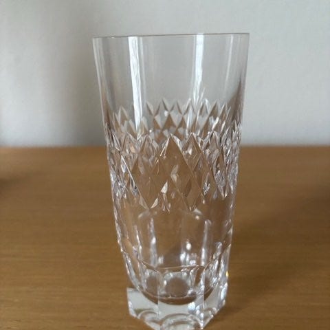 Sæt med klar glas isspand og tilhørende is-tang samt flere lave drikkeglas i matchende slebet mønster. Drikkeglassene er lave, runde glas med samme mønster, velegnet til servering af fx whisky, drinks eller andre kolde drikke. 4 i alt