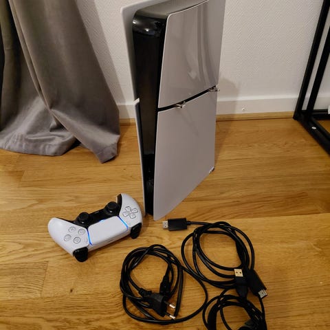 Sony PlayStation 5 konsol i hvid farve. Konsollen har indbygget diskdrev på fronten. Medfølgende trådløs DualSense-controller i matchende hvidt design. Egnet til spil, streaming og underholdning med understøttelse af moderne PlayStation 5-spil og medier.