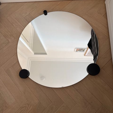Søstrene grene rundt spejl med tynd sort ramme. Ø 70 cm
