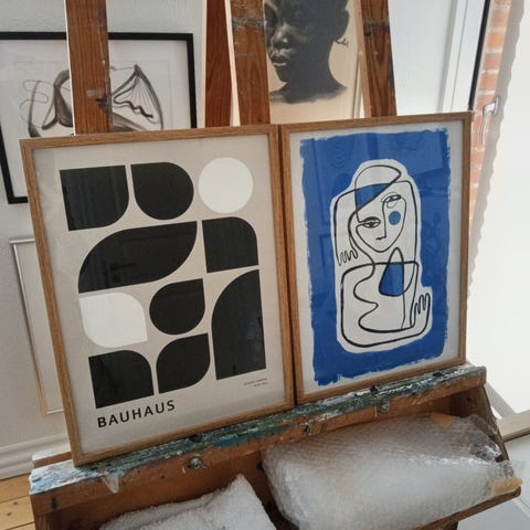 Sæt af billedrammer med kunstplakater i forskellige motiver. Alle plakater er indrammet i enkle rammer med glas. Egnede til ophæng i stue, gang eller kontor som vægdekoration.