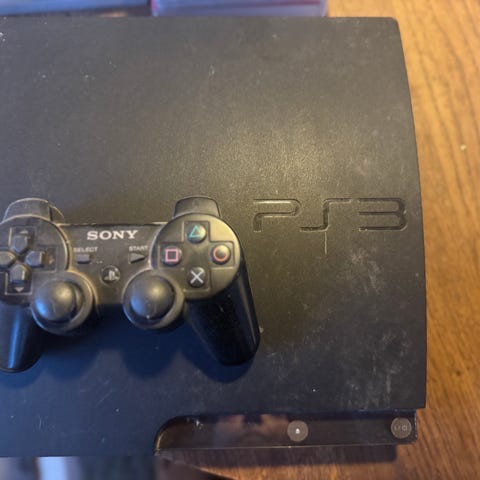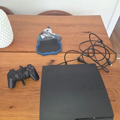 Sony Playstation 3 konsol med tilhørende kabler, to trådløse DualShock-controllere og ladestation til controllere. Medfølgende flere fysiske spil i originale covers samt en Skylanders-portal, som kan bruges sammen med de kompatible Skylanders-spil til Playstation 3. Velegnet til spil, film og anden underholdning via PS3-platformen.