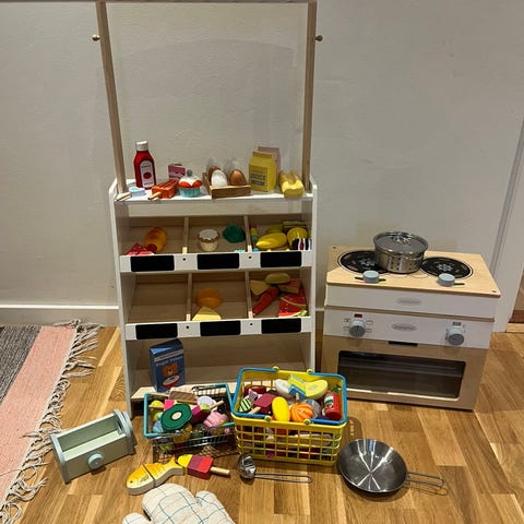 Komfur og markedsbod sammen med en masse mad legetøj