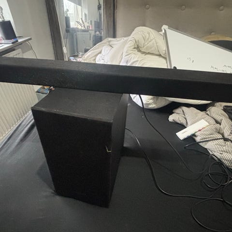 Samsung soundbar med trådløs subwoofer i sort. Systemet består af en lang, slank soundbar til placering foran tv’et samt en separat subwoofer til dybere bas. Enheden tilsluttes strøm via medfølgende strømforsyning og strømkabel. Egnet til brug sammen med tv eller andre lydkilder via de tilgængelige tilslutninger på bagsiden (se mærkat og stikpanel på produktet for præcise modeller og porte). Velegnet til hjemmebrug i stue eller tv-rum, hvor der ønskes forbedret tv‑ og filmljud sammenlignet med indbyggede tv‑højttalere.