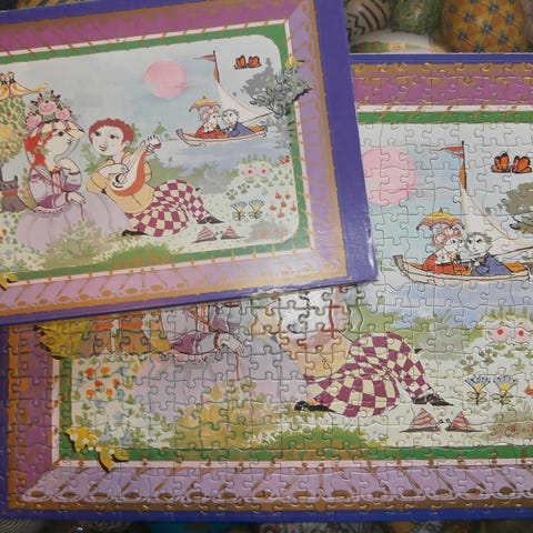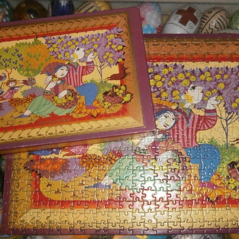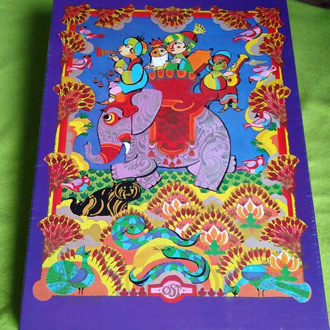9 forskellige puslespil, tegnet til Irma, med farverige illustrationer. Motiverne viser forskellige fantasifulde og eventyrlige scener med mennesker, dyr og natur i stærke, klare farver. Æskerne er rektangulære og dekoreret med detaljerede tegninger på låget. Egnet som underholdning for børn og voksne eller som samlerobjekter. Sælges samlet. Giv bud