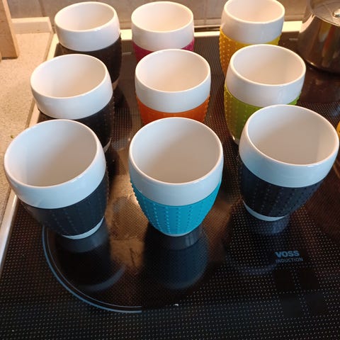 Bodum krus med silikonebånd i flere farver. Krusene har hvid inderside og øverste del, mens den nederste del er forsynet med farvet silikonebånd, der giver et bedre greb og isolerer mod varme. Velegnet til varme drikke som kaffe, te eller kakao. Sættet består af flere krus i forskellige farver, som kan bruges i køkkenet, på kontoret eller til servering for gæster.