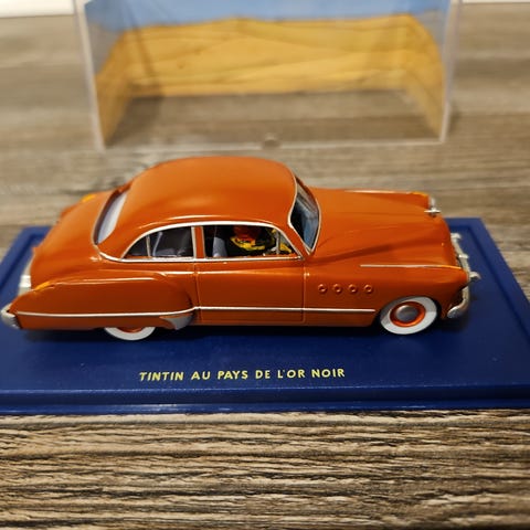Tintin Le Lotus Bleu modelbil i grøn farve. Modellen forestiller bilen fra Tintin-historien "Le Lotus Bleu" og står på en blå base med klar plastkasse. Figuren af Tintin er placeret bag på bilen. Medfølgende certifikat/mappe kan ses på billederne. Velegnet som samlerobjekt eller udstillingsmodel. Bil nummer 9. Har en lille skade i den ene hjørne af top af kassen med certifikat