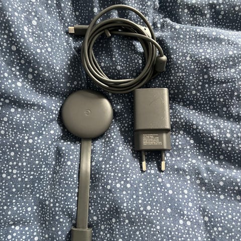 Denne Chromecast er brugt, men fremstår flot og fungerer helt perfekt. Perfekt løsning til streaming af film, serier og apps direkte på dit TV.