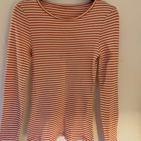 T-shirt med lange ærmer. Stribet rosa og hvid. Sikkert bomuld. Str 36.