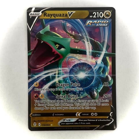 Pokémon Rayquaza V samlekort fra Rapid Strike-serien. Kortet viser Rayquaza V med angrebene Dragon Pulse og Spiral Burst samt 210 HP. Swsh147 Standard Pokémon TCG-kortstørrelse, egnet til samling eller spil i Pokémon Trading Card Game.