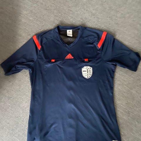Diadora dommersæt til fodbold bestående af tøj i herrestørrelse M. Sættet omfatter blandt andet sort dommertrøje, shorts, lange bukser og strømper i matchende farver. Der medfølger også dommertilbehør som kort, fløjte, notekort og kortmappe, som ses på billederne. Tøjet er egnet til brug som dommerbeklædning til fodboldkampe og træning. Farverne er primært sorte med enkelte kontrastdetaljer. Materialet er typisk let og funktionelt sportstekstil velegnet til fysisk aktivitet på banen.