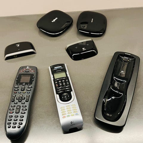 Logitech Harmony Ultimate inkl. hub, lader, strømforsyninger og IR-extendere.