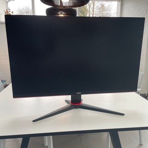 AOC skærm på 24" i sort. Skærmen leveres med strømkabel, som ses på billederne. Velegnet til brug med stationær computer eller som ekstra skærm til arbejdsstation eller gaming-opsætning, afhængigt af tilgængelige tilslutninger på brugerens udstyr. Yderligere tekniske specifikationer som opløsning, opdateringshastighed og indgange fremgår ikke af oplysningerne og bør kontrolleres ved behov.