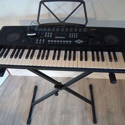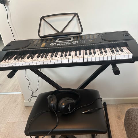 Sælger K1 keyboard med 61 tangenter i sort. Instrumentet har indbyggede højttalere og kontrolpanel med forskellige funktioner og lyde. Velegnet til øvning derhjemme og generel musikundervisning. Leveres med nodestativ samt tilbehør som hovedtelefoner og kabler, jf. billederne.