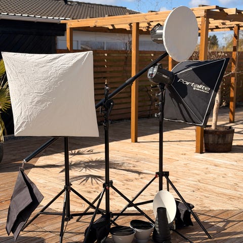 Elinchrom studioblitz sæt med flere blitzhoveder og tilbehør. Sættet omfatter blandt andet softbox, reflektorparaply, snoot, standardreflektor, honeycomb‑gitter, reflektor samt stativer og kabler. Egnet til studiebrug, portrætfotografering og produktfotografering, hvor der er behov for kontrolleret kunstig belysning.