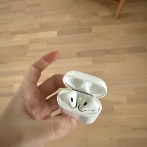 Gamle AirPods. Efter jeg opdaterede min iPhone så kobler de fra efter 5 min. Sælges derfor billigt - måske nogle kan bruge etuiet eller andet