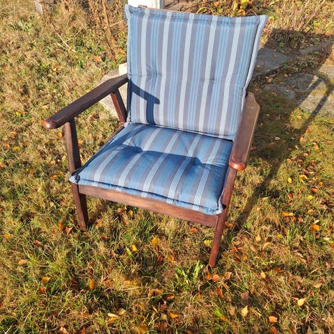 2 lænestole i poleret træ fra 1960-1970 erne. De har rødbrune hynder. Den ene hynde mangler en knap og en siddehynde har været revnet bagerst på undersiden og er syet i hånden., De måler b67 Sh43 cm. Prisen er for begge.