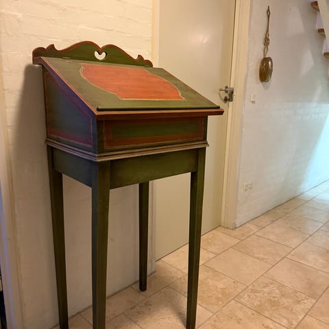 Pult i sæbebehandlet massiv bøg med plade af sort linoleum.