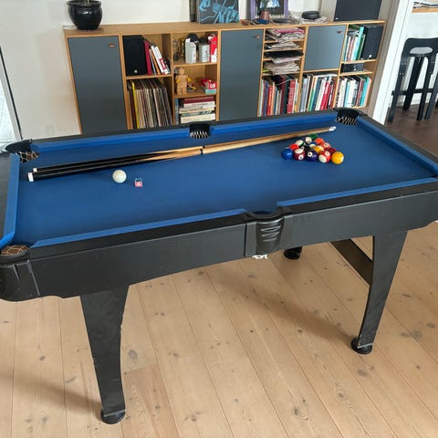 Pænt poolbord med tilbehør som ses på foto. Det fungere glimrende og dugen kan med lidt børstning sagtens fremstå mere ren for gammel kridt. Ingen skader. Sælges da rummet skal have anden funktion. Nypris ca 4.999,-