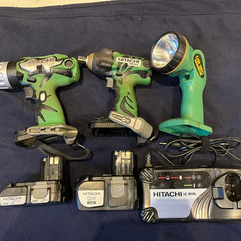 Hitachi DV 18DSL bore-/skruemaskine 18V i grøn farve. Sættet omfatter 18V Li-ion batteri på 5,0 Ah, oplader, sidehåndtag og transportkuffert med indlæg til maskine og tilbehør. Bore-/skruemaskinen er egnet til almindelige bore- og skrueopgaver i hjemmet og på værkstedet, hvor der er behov for en batteridrevet løsning med slagfunktion og justerbart moment.