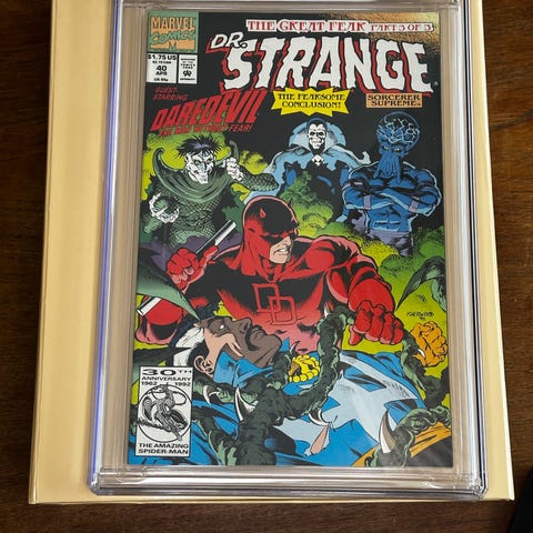 Marvel The Amazing Spider-Man tegneseriehæfte. Forsiden viser Spider-Man i kamp mod en modstander, omgivet af grønne planter og en stor gul hånd i forgrunden. Bagsiden har en reklame med teksten “Hit ’Em High. Hit ’Em Low.” og illustrationer fra forskellige actionspil. Hæftet er indkapslet i en hård plastbeskyttelse, som beskytter omslaget og siderne. Velegnet til samlere af superhelte-tegneserier og Marvel-relaterede udgivelser.