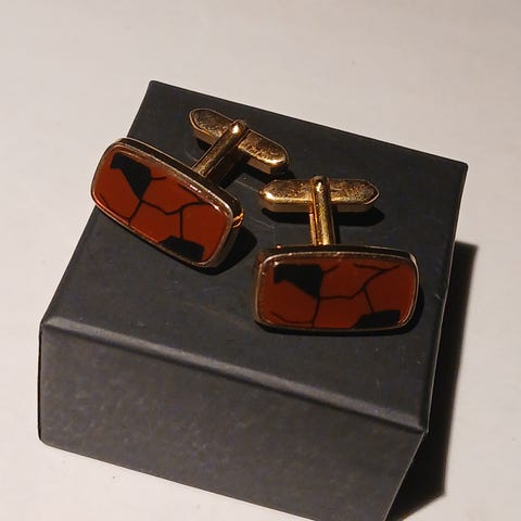 består af stribede manchetknapper og slipsholder til daglig brug i original æske.