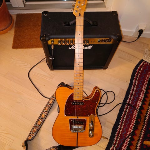 Yderst vellykket Harley Benton TE-52 telecaster. Massiv krop i ask og karamelliseret ahorn gribebræt. Guitaren har fået et professionelt setup og justering med bl.a. Graphtech nut, locking tuners, båndpolering m.m.