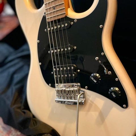 Tremolo-bar medfølger også. Guitaren er oprindeligt købt i 2018. Det eneste synlige brug, er de to sidste vedhæftede billeder og fretboardet, som efter års brug er en smule beskidt. En billig gig-bag medføler også. Guitaren kræver også nye strenge.