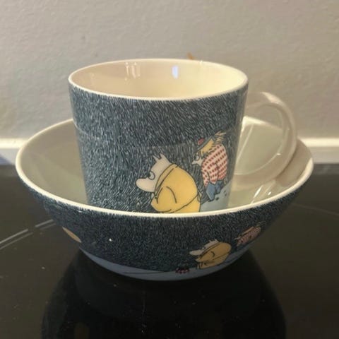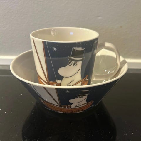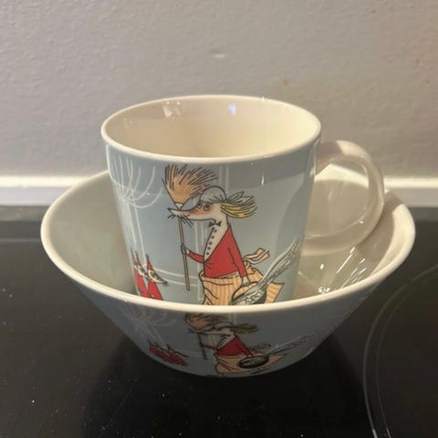Arabia Stinky kop og skål i porcelæn med motiv fra Mumitroldene. Sættet består af en kop med hank og en skål, begge i grå og hvid med Stinky-figur på ydersiden. Velegnet til fx morgenmad, snacks eller varme drikke. Motivet og producent er markeret på bunden af både kop og skål.