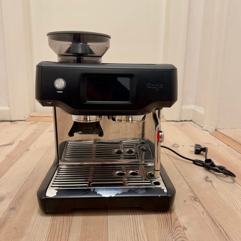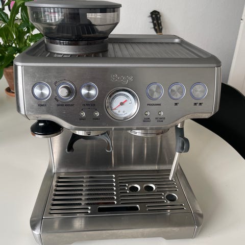 HELT NY Sage Barista Express espressomaskine. Semiautomatisk espressomaskine med indbygget kaffekværn, dampdyse til mælkeskum og betjeningspanel med trykmåler og drejeknapper. Inkl alle originale accessories fx mælkekande.