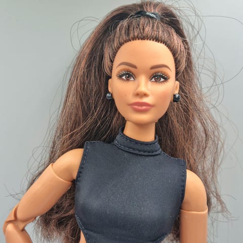 Barbie dukke med kort, brun frisure og bevægelige led i arme og ben. Dukken er iført en enkel, mørk kjole uden stropper. Hovedet er aftageligt, som vist på billederne. Velegnet til leg, udklædning og som supplement til andre Barbie-dukker og tilbehør.