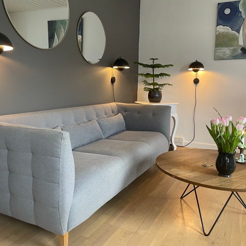 Sofaen er købt i 2023 og fremstår i god stand med almindelige brugsspor. Der er enkelte pletter på sæde og puf (se billeder), men intet der påvirker komforten. Den er stadig super behagelig at sidde i og har et stilrent, minimalistisk look.