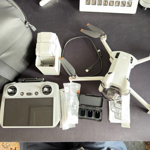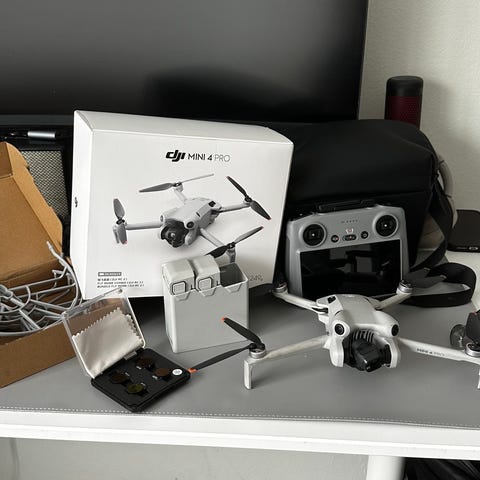 Jeg sælger min DJI mini 4 pro drone med en fly more combo pakke, som indeholder ekstra batterier, taske, rc2 fjernbetjening og ekstra propeller. Dronen vejer 249 g og flyvningen begrænses af færre regler.