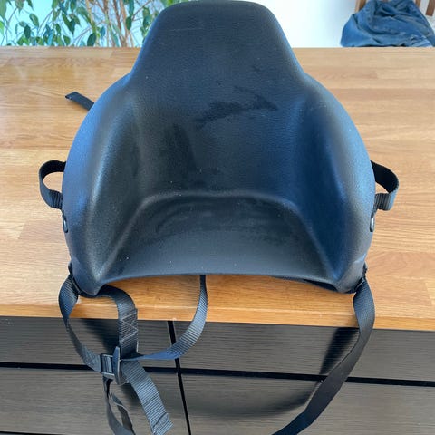 Sæde til at spænde på motorcykel eller scooter så børn fra 5 år kan sidde med bag på. Alt medfølger til det, det er let at spænde på. Brugt 1 sæson, indtil min søn var stor nok. Han var 7-8 år da han brugte det. Jeg har også et par bukser i str 140 til salg for 100 kr.