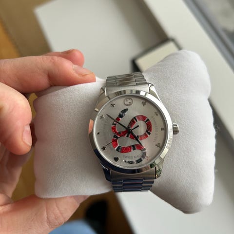 Gucci unisex armbåndsur i rustfrit stål. Uret har rund urkasse med lys skive og datoangivelse ved kl. 4–5. Lænken er i flerleddet rustfrit stål med foldelås, hvor Gucci-navnet fremgår. Leveres i Gucci-æske som vist på billederne. Egnet til både mænd og kvinder som klassisk hverdags- eller dress-ur. Skal have nyt batteri